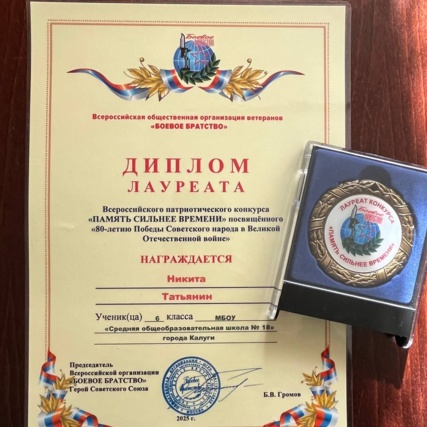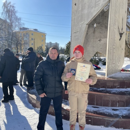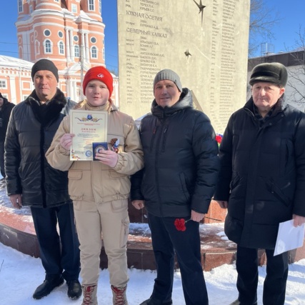 На митинге, дипломом лауреата и почетным знаком отметили победителей Всероссийского патриотического конкурса «ПАМЯТЬ СИЛЬНЕЕ ВРЕМЕНИ», среди них юнармеец отряда «Гарнизон» имени Героя Российской Федерации В.Н. Игнатова Никита Татьянин.
